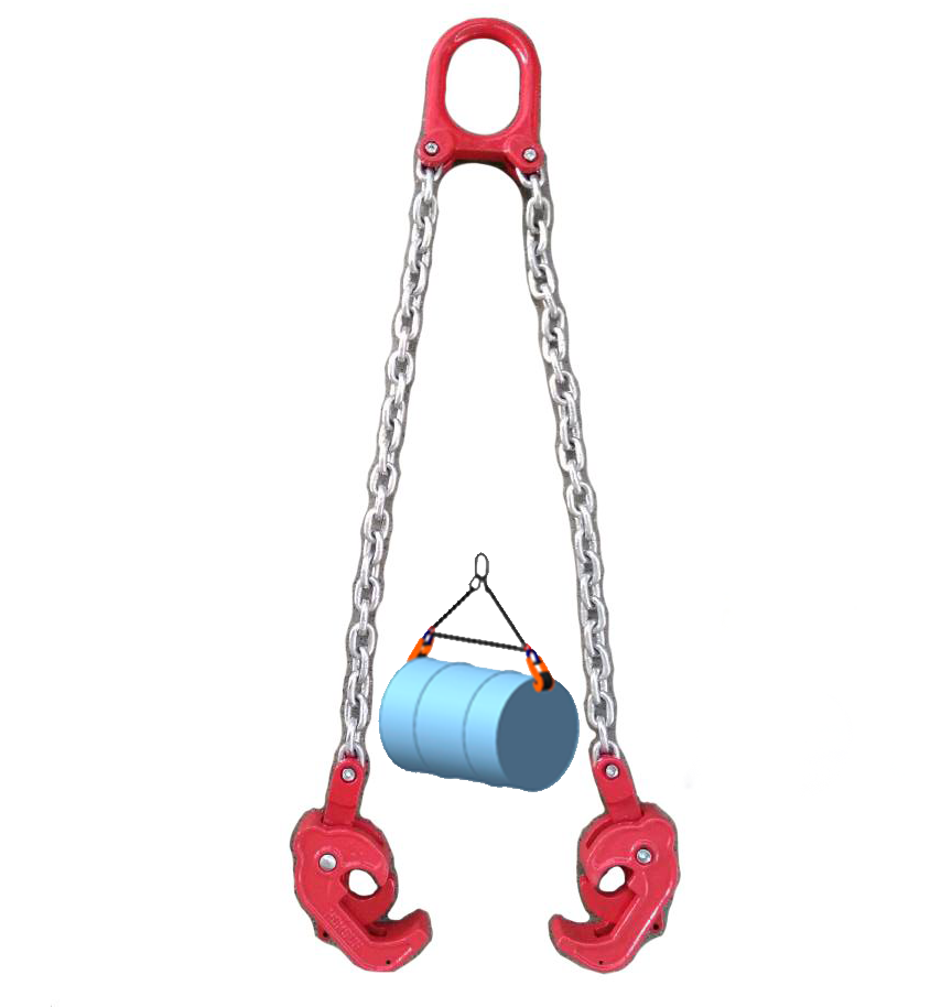 Цепной захват – представляет собой компактное легкое приспособление, которое состоит из звена, двух цепных ветвей и специальных концевых захватных элементов. Его крепление выполняется непосредственно за кромку бочки, а окончательная фиксация происходит под действием тяжести груза.