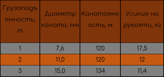 В комплекте с лебедками идут две съемные рукоятки. В корпусе лебедок монтируется барабан, передаточный механизм и тормоз. Надежность в работе обеспечивается за счет простой конструкции шестеренной передачи и стопора.